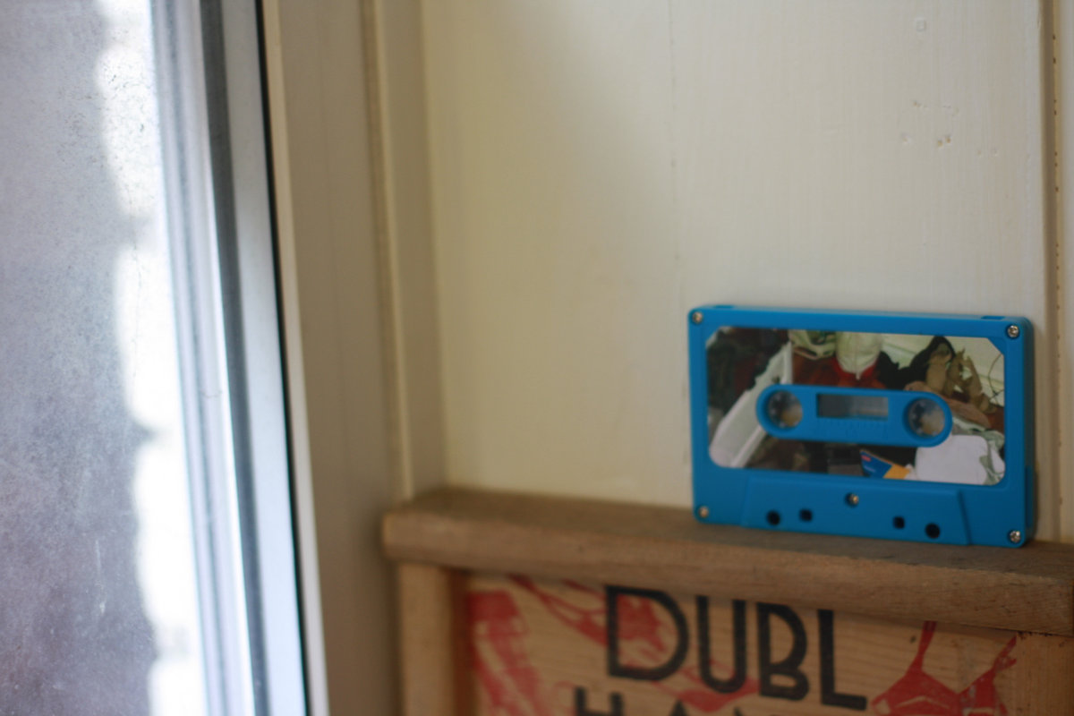 Professionally dubbed 4-song tape, complete with labels depicting Dorothea's disgusting messy bedroom floor. Cover is a cross-stitch {found image} with the words 'Calm Your Buddy Down'. Tape is bright aqua-blue. Comes with clear case that can double as a cellphone stand for watching videos in bed, fyi (know from experience). Limited run of 100 tapes!